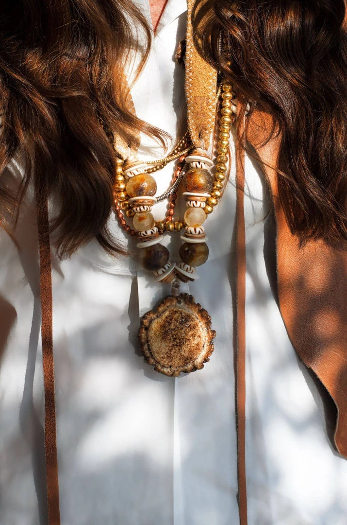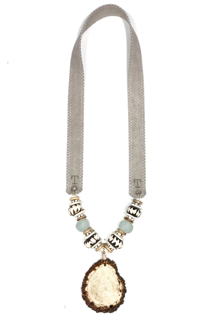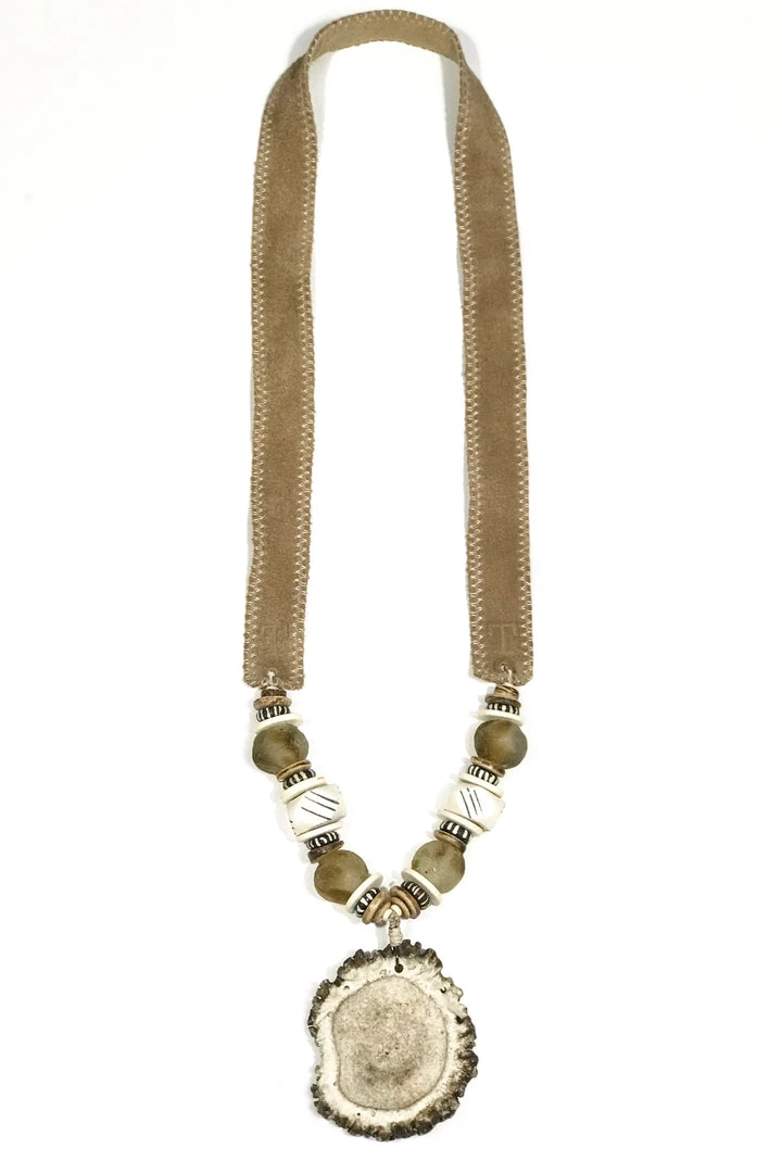 The Twine & Twig Burr Necklace is designed with a naturally shed elk burr, globally sourced beads and tied onto our signature branded suede strap.Â