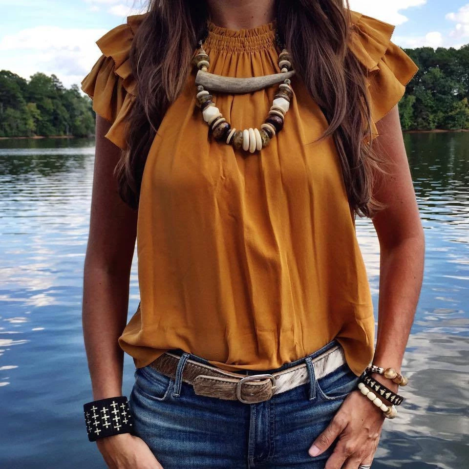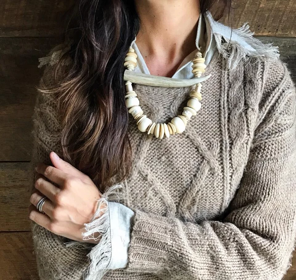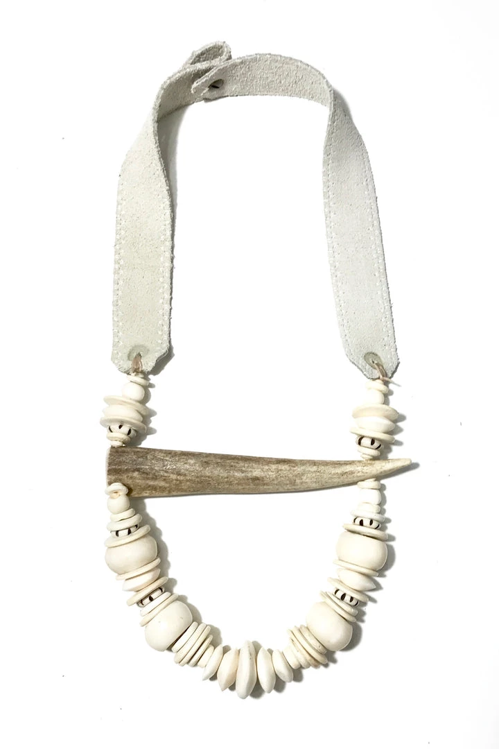 The Twine & Twig Tip Classic Necklace is designed with a naturally shed deer antler, globally sourced beads and tied onto a pair of our signature branded suede straps. The necklace features two length options with a brass snap closure.Â