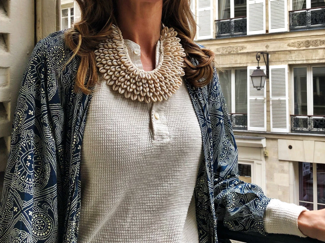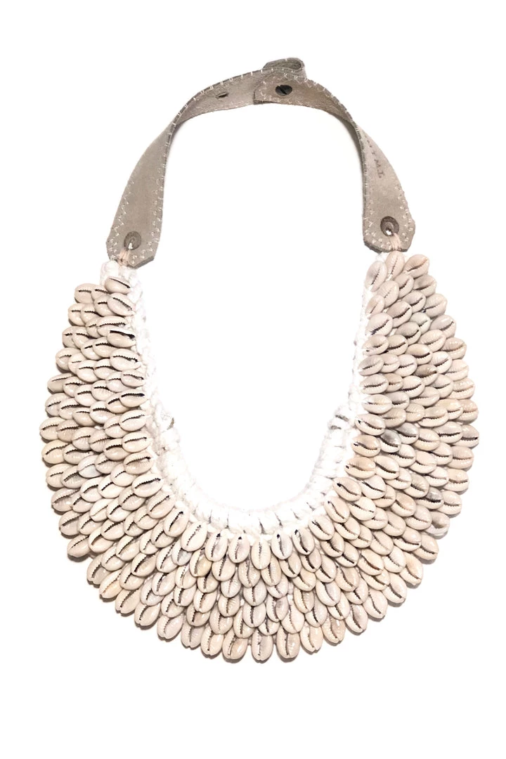The Twine and Twig Cowrie Collar is designed using natural string made of pineapple leaf fibers woven with cowrie shells. Each Collar is hand tied onto our signature branded suede straps. The necklace features two length options with a brass snap closure.