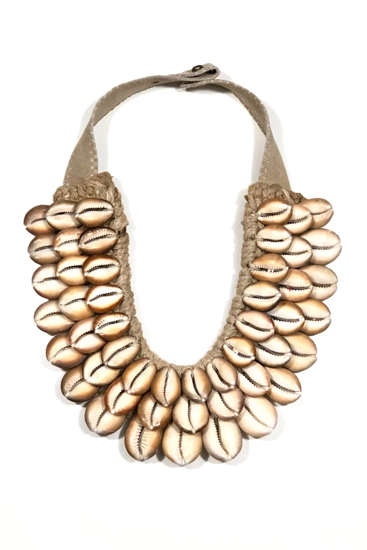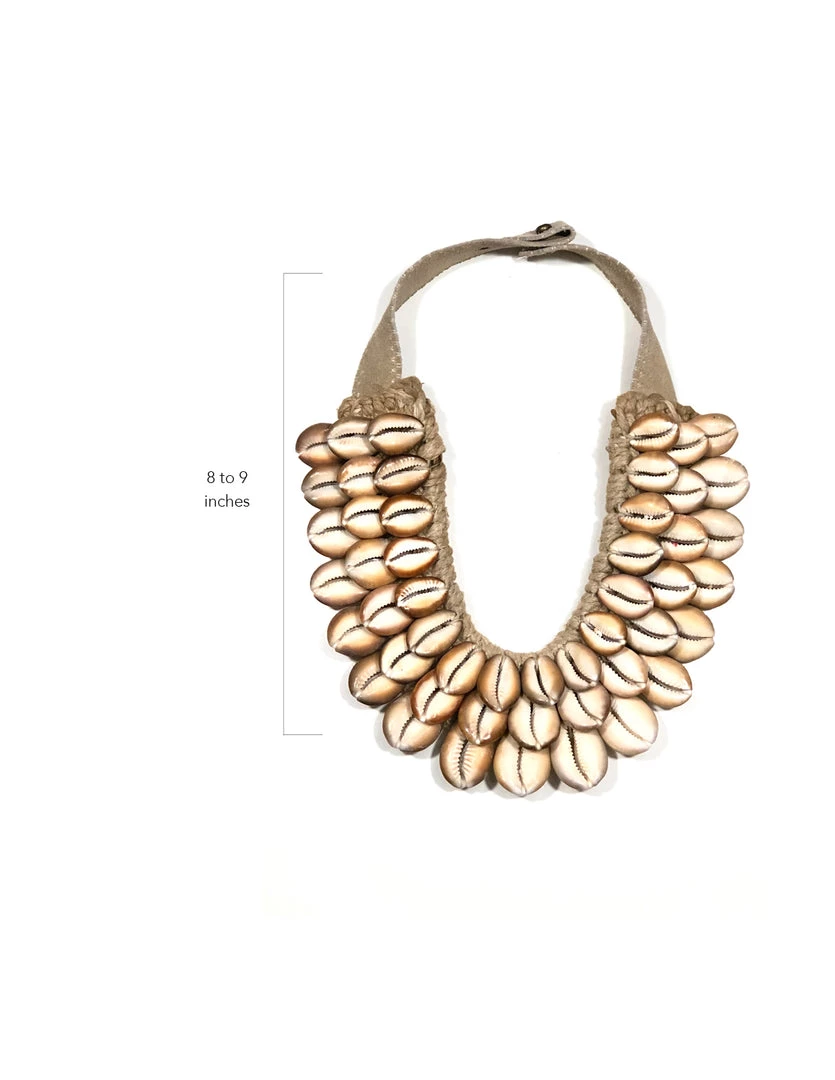 The Twine and Twig Cowrie Collar is designed using natural string and pineapple leaf fibers woven with cowrie shells. Each Collar is hand tied onto our signature branded suede straps. The necklace features two length options with a brass snap closure.