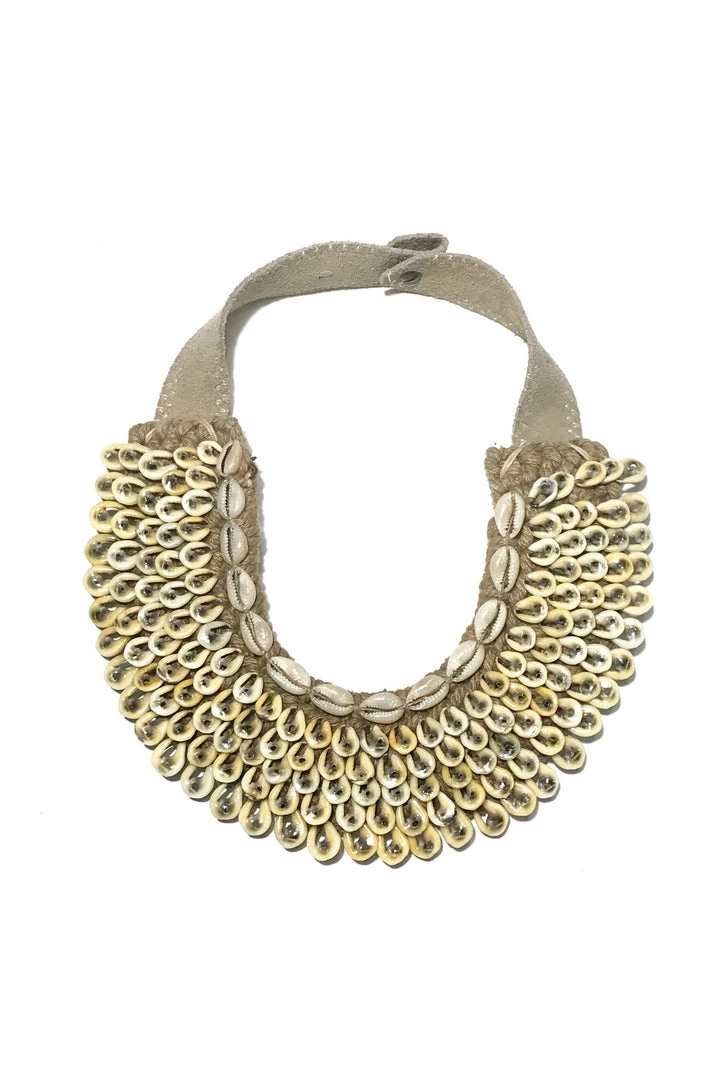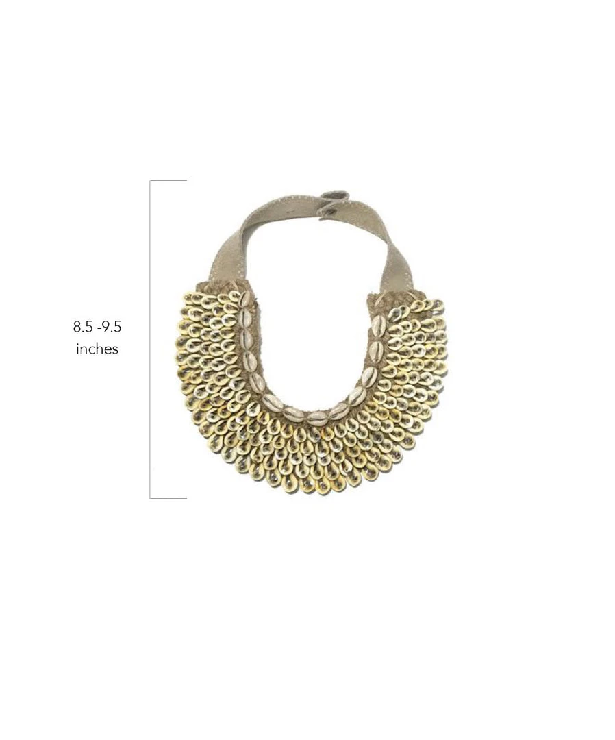 The Twine and Twig Cowrie Collar is designed using natural string made of pineapple leaf fibers woven with cowrie shells. Each Collar is hand tied onto our signature branded suede straps. The necklace features two length options with a brass snap closure.
