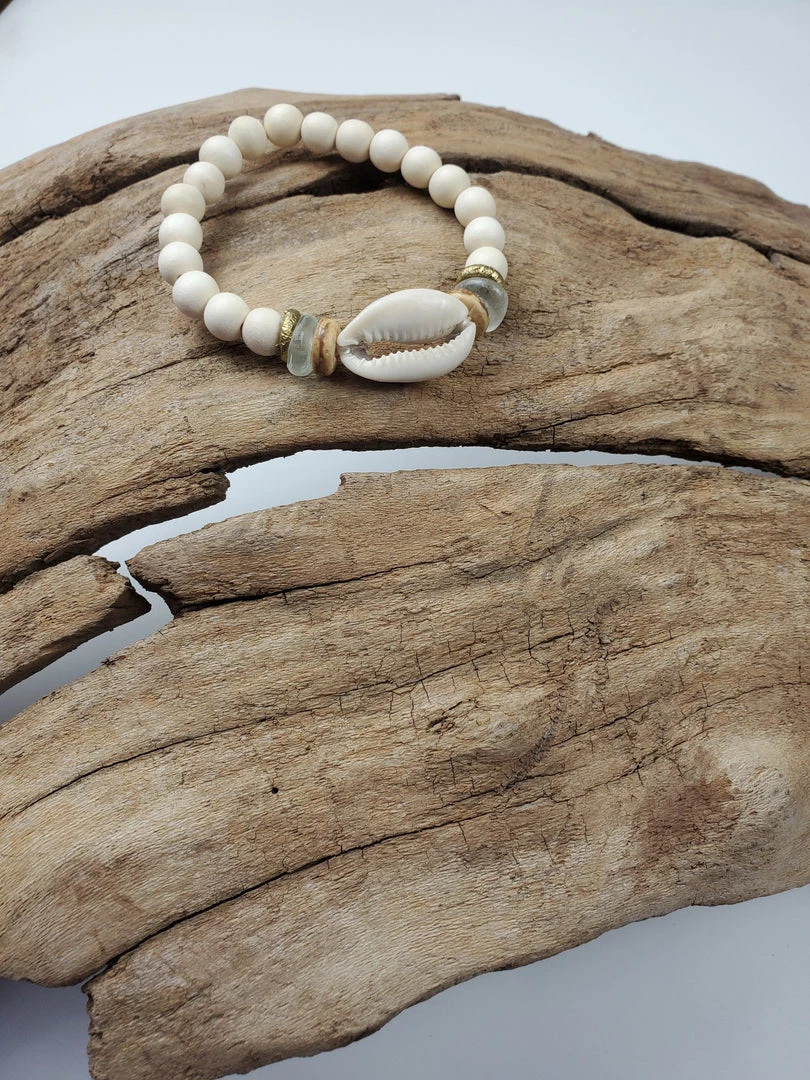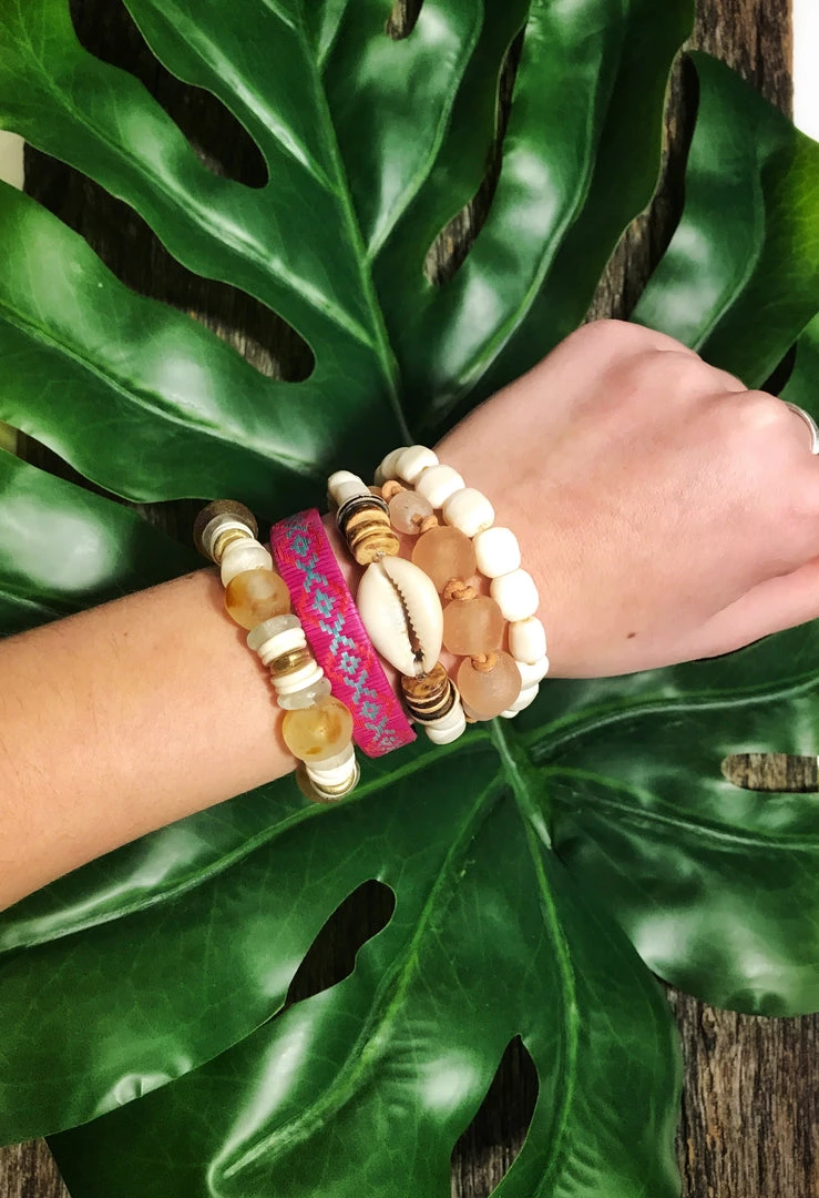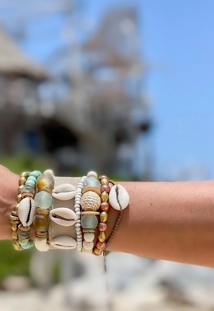 The Twine & Twine Single Cowrie Stack is designed using globally sourced beads and a cowrie shell. They can be worn individually or stacked up.