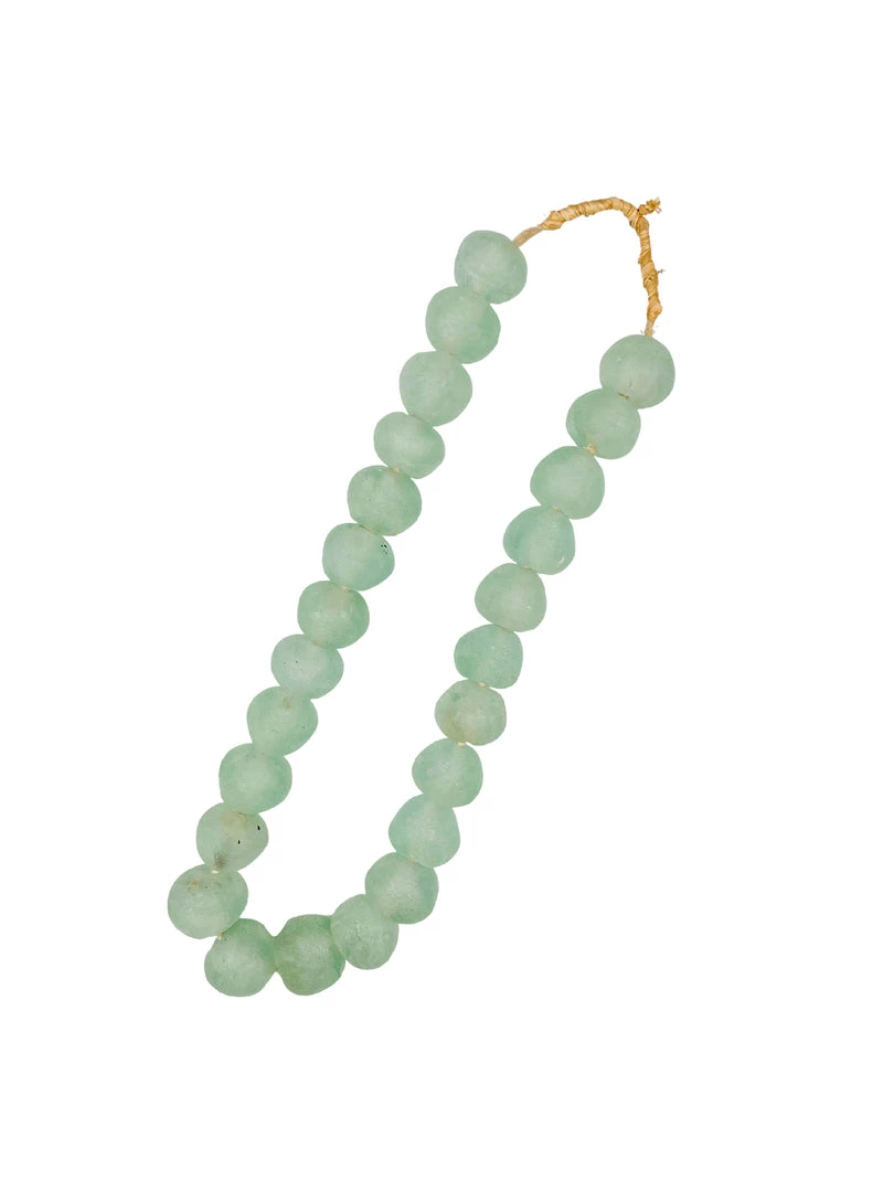 These recycled glass strands are handmade by people of Ghana- hand picked by Twine & Twig. The beads are made from scrap and unusable glass products that are ground to a fine powder before being poured into clay molds and baked turning them into these stunning glass beads.