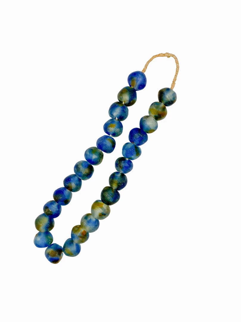 These recycled glass strands are handmade by people of Ghana- hand picked by Twine & Twig. The beads are made from scrap and unusable glass products that are ground to a fine powder before being poured into clay molds and baked turning them into these stunning glass beads.