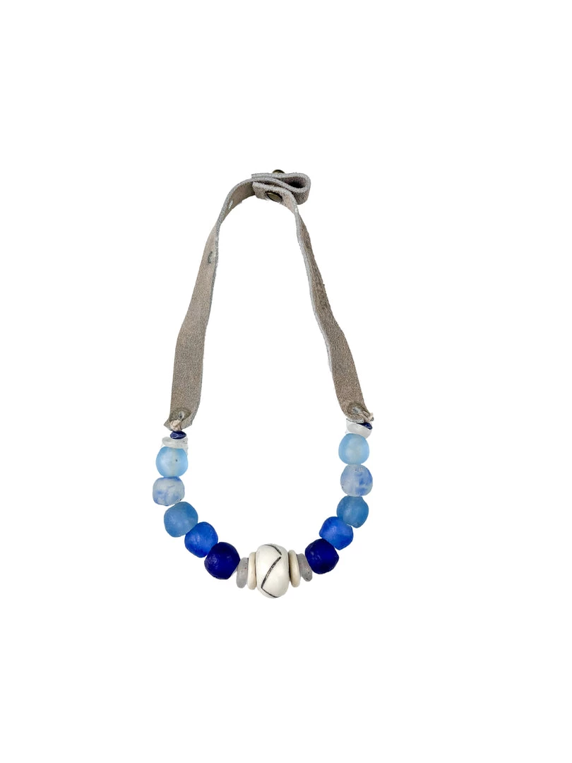 The Twine & Twig Layer Choker is created for those who want to have a simple piece to wear along or layer with your other favorite jewelry. It is designed using globally sourced beads and is tied onto thin branded suede straps. The choker has three length options with a brass snap closure.Â