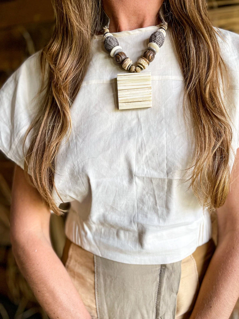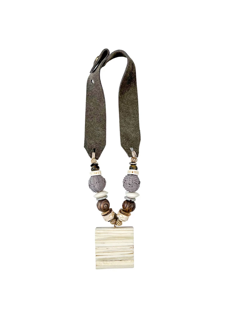 The Twine & Twig Mid Pendant Necklace is designed with globally sourced beads, a bone pendant and tied onto our signature branded suede straps. The necklace features two length options with a brass snap closure.