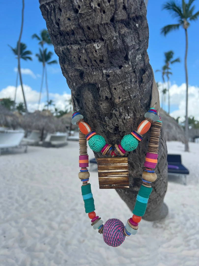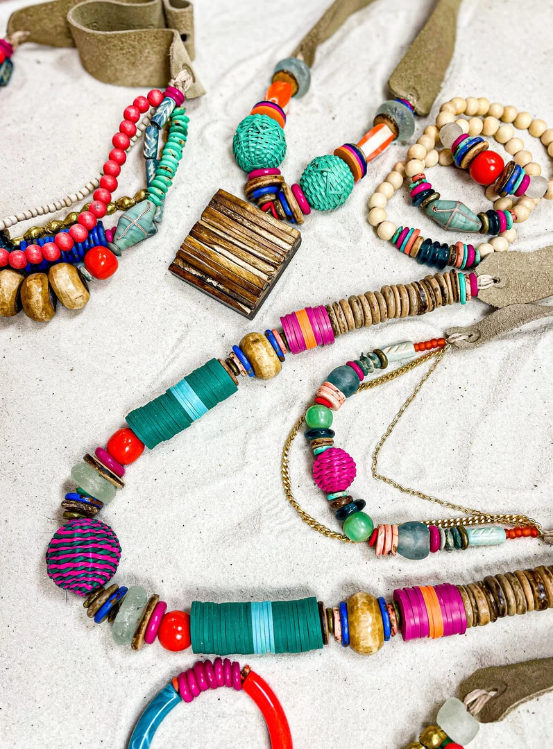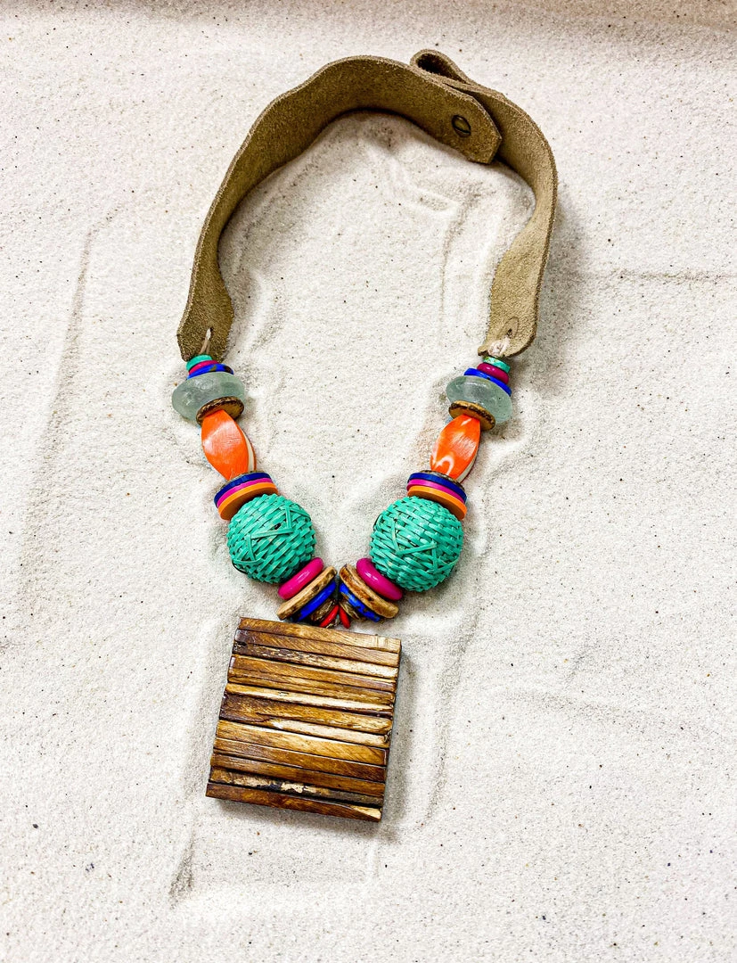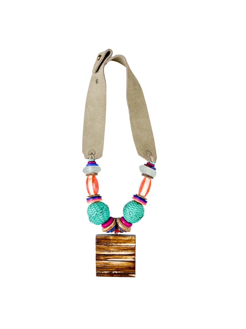 The Twine & Twig Mid Pendant Necklace is designed with globally sourced beads and tied onto our signature branded suede straps. The necklace features two length options with a brass snap closure.