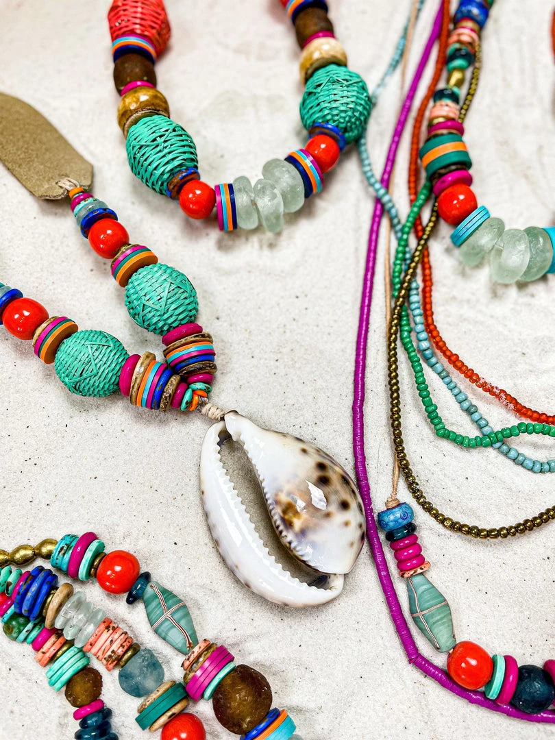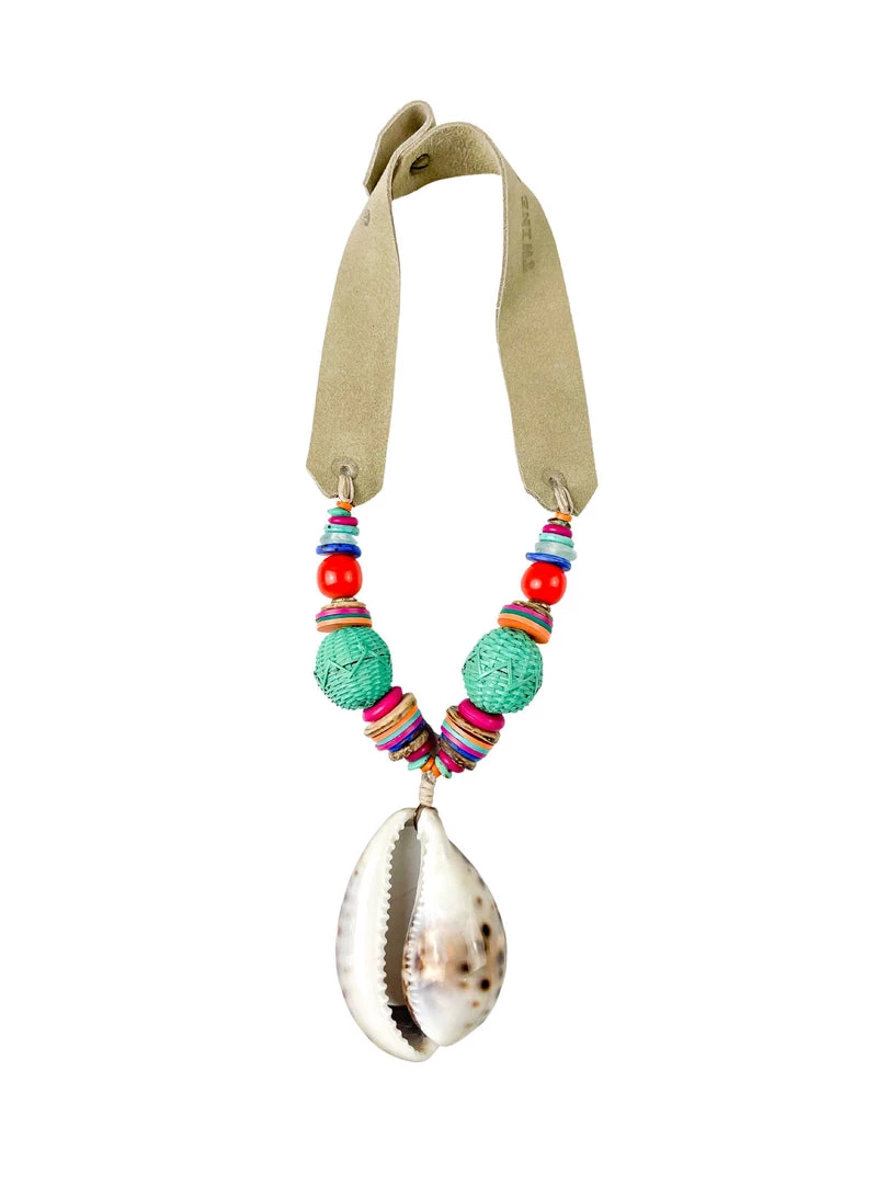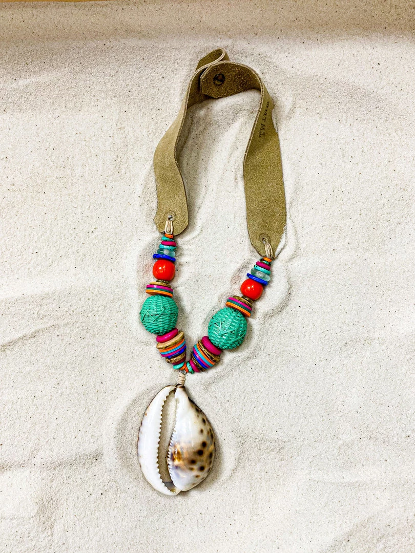 The Twine & Twig Mid Pendant Necklace is designed with globally sourced beads, a large cowrie shell slice pendant and tied onto our signature branded suede straps. The necklace features two length options with a brass snap closure.