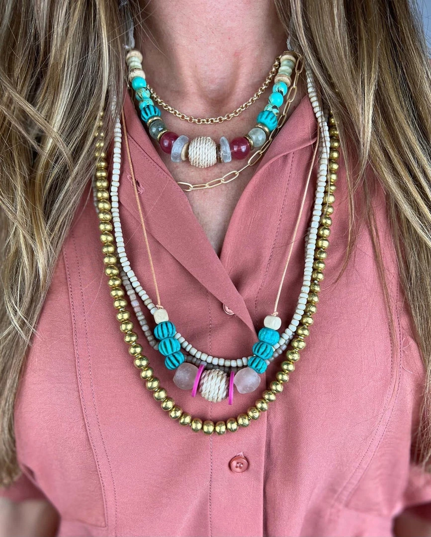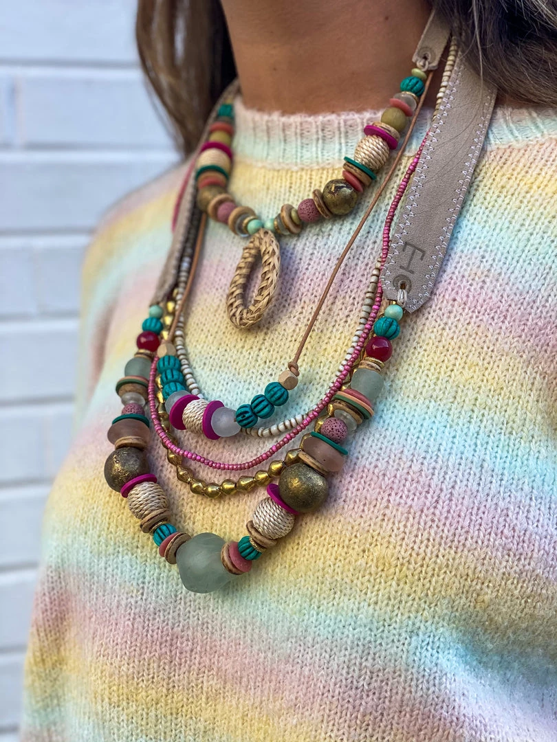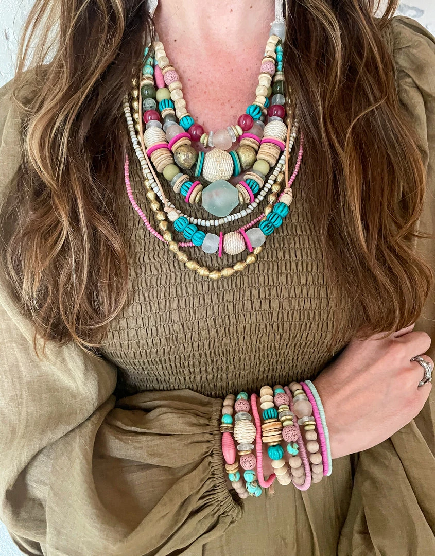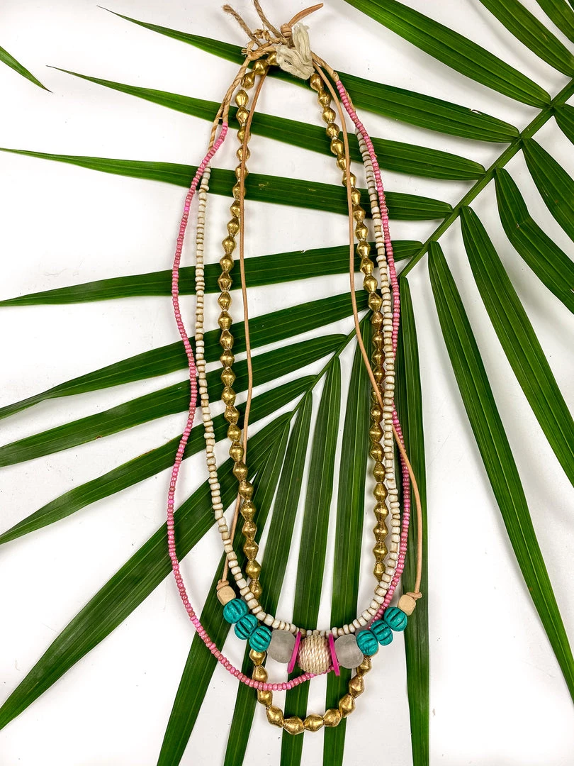 Our Layers are handmade by the women of Ghana – handpicked by Twine & Twig. Globally sourced beads are placed onto natural leather cord.Â