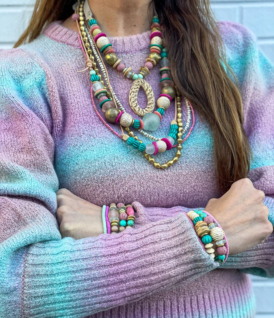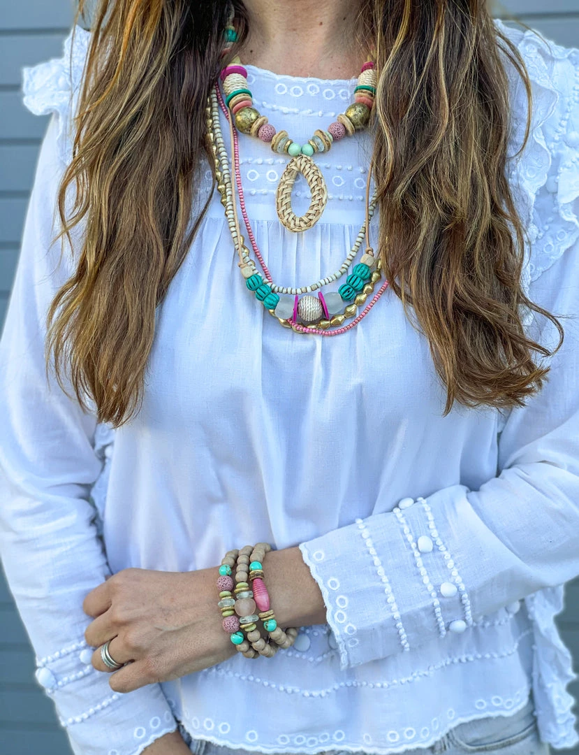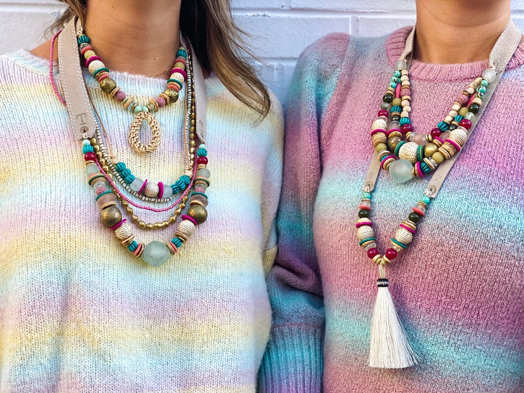 Our Layers are handmade by the women of Ghana – handpicked by Twine & Twig. Globally sourced beads are placed onto natural leather cord.Â