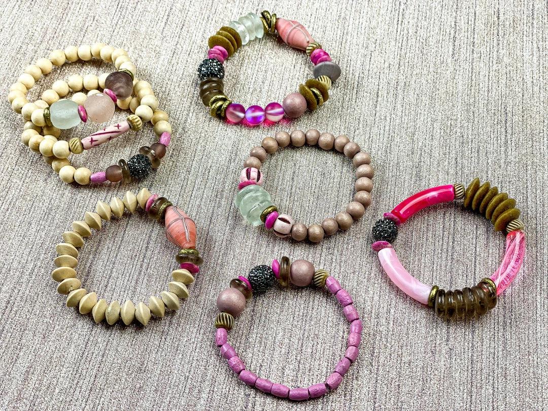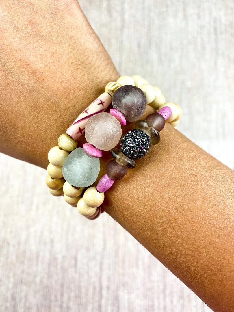 The Twine and Twig Stacks are designed using globally sourced beads. Stacks come as a set of 3 stretch bracelets.