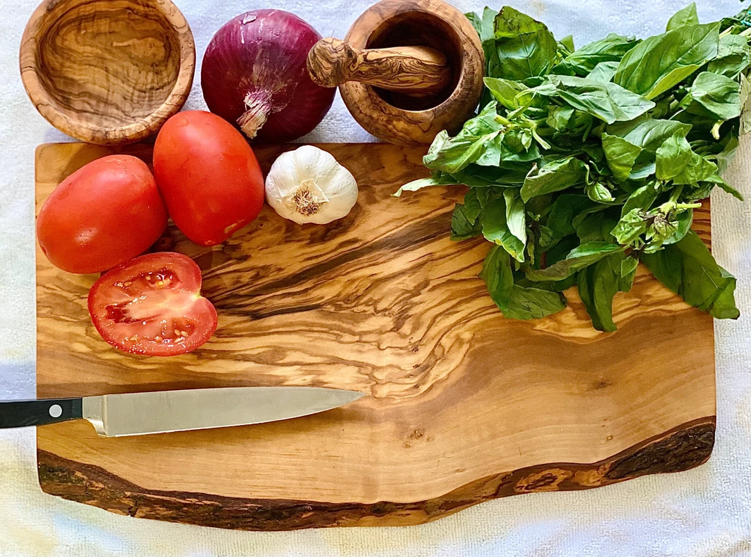 The Rustic Cutting Board is suitable for cutting bread, slicing cheese, chopping vegetables, and carving meat. Olive wood is a hardwood making it very dense and durable for everyday use. Olive wood is nonporous so no germs or odors are retained.