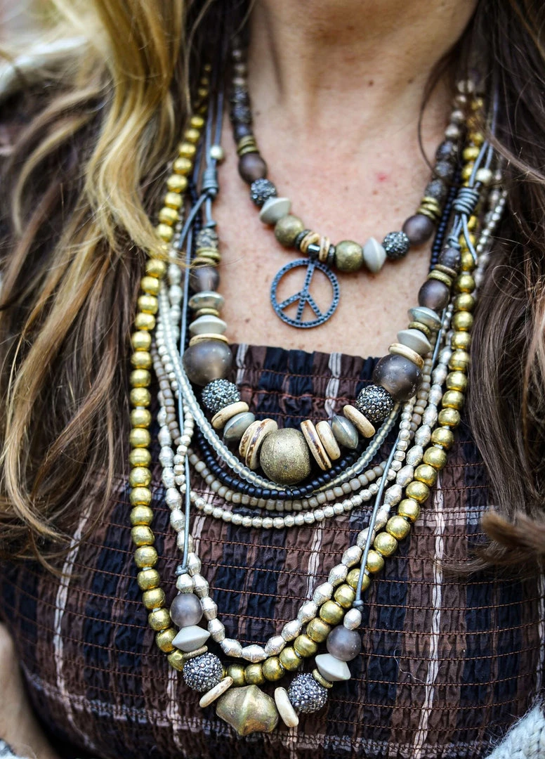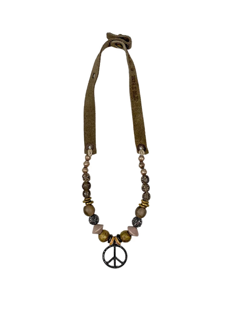 The Twine & Twig Slim Classic is created for those who want to have a simple piece to wear along or layer with your other favorite jewelry. It is designed using globally sourced beads, a peace sign made with pavè beads and is tied onto thin branded suede straps. The choker has three length options with a brass snap closure.