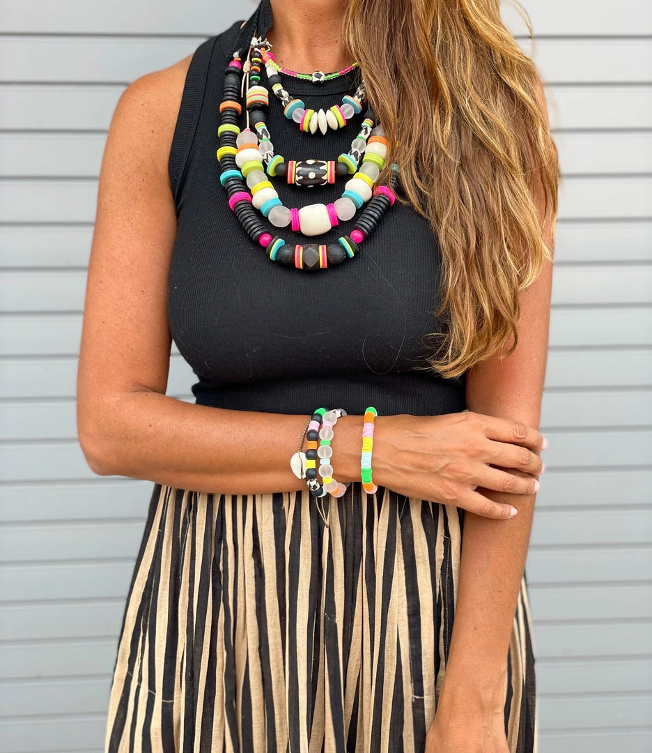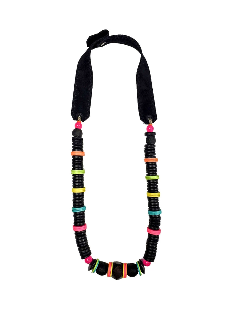 The Twine & Twig Stacked Classic Necklace is designed with globally sourced beads and tied onto our signature branded suede straps. The necklace features two length options with a brass snap closure.Â