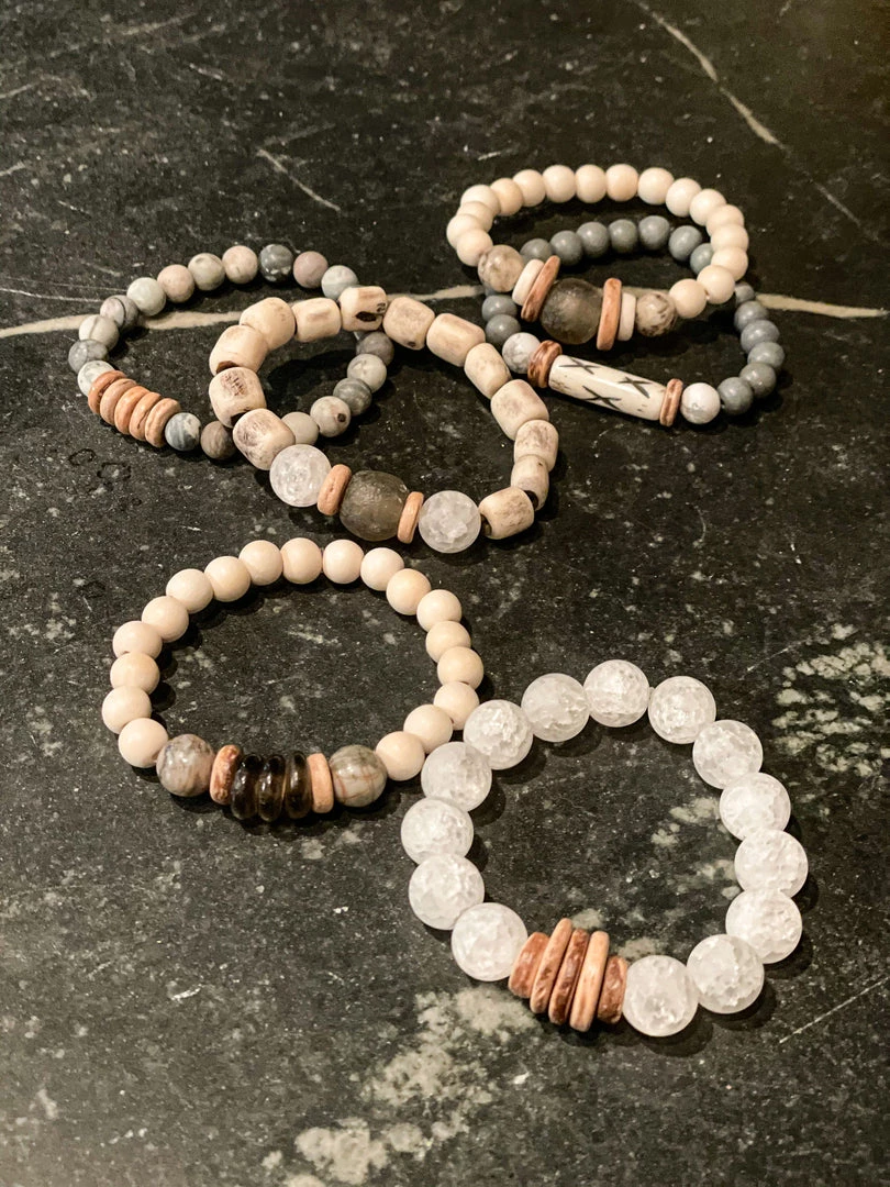 The Twine and Twig Stacks are designed using globally sourced beads. Stacks come as a set of 3 stretch bracelets.