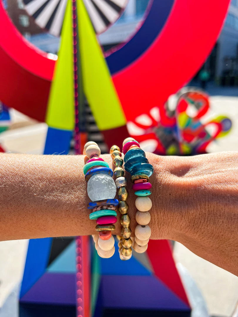 Twine and Twig Stacks are designed using globally sourced beads. Stacks come as a set of 3 stretch bracelets.