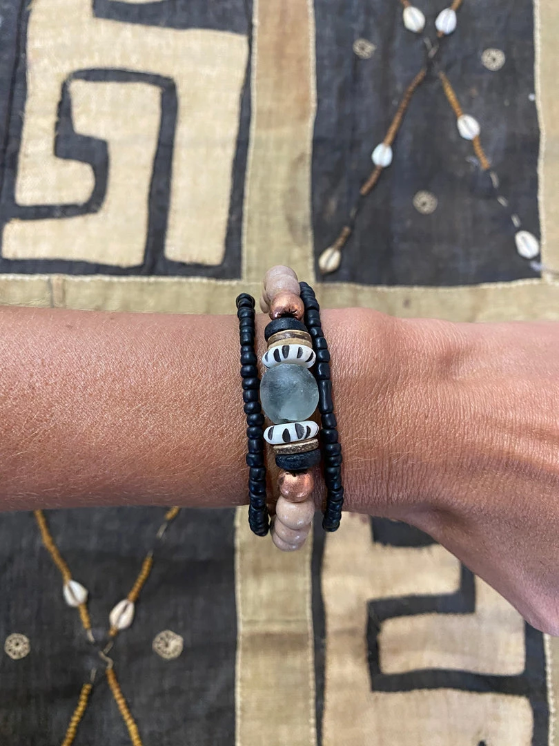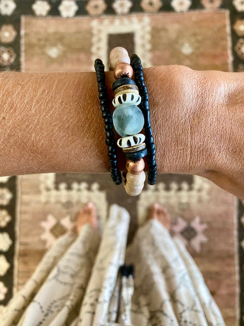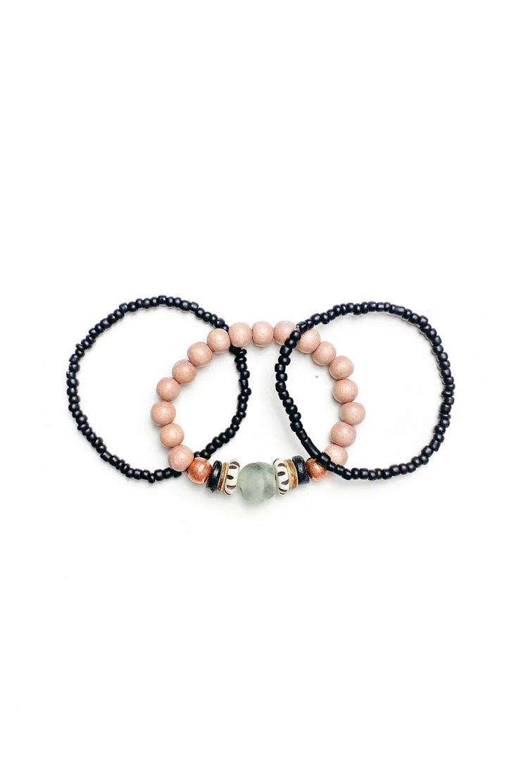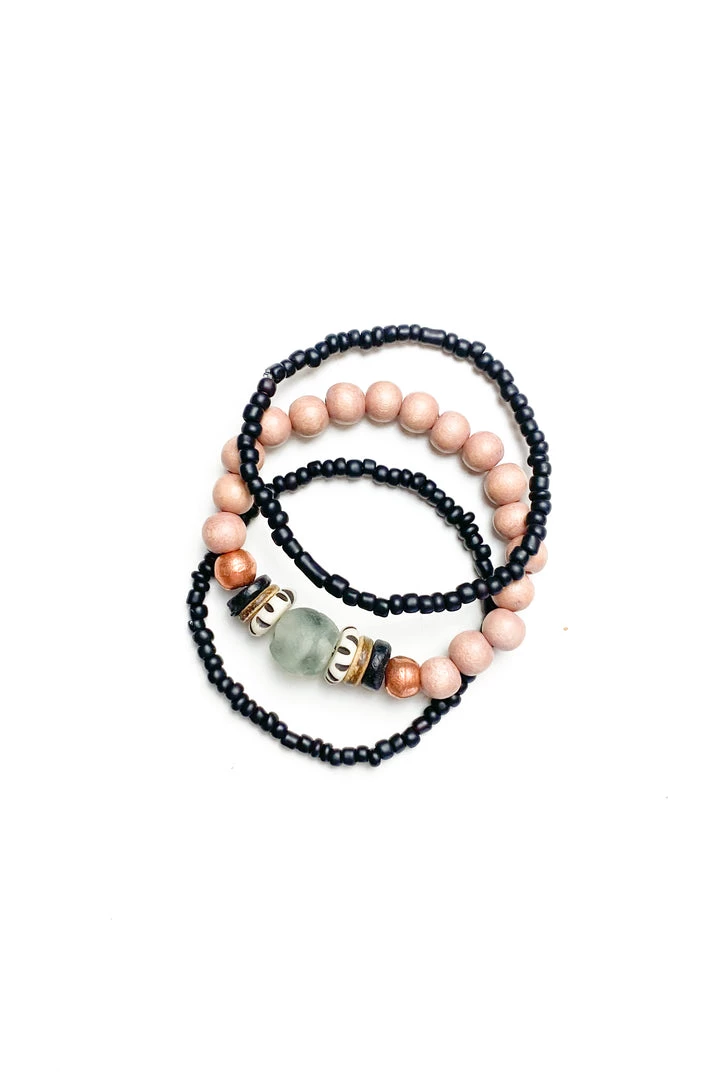 The Twine and Twig Campaign Zero Stacks are designed using globally sourced beads. Stacks come as a set of 3 stretch bracelets. This set includes one bracelet on filipino wood beads and 2 made from strands of seed beads.