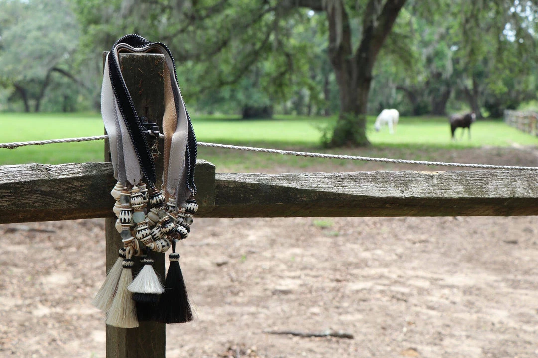 The Twine & Twig Tail Necklace is designed with a natural horsehair tassel, globally sourced beads and tied onto our signature branded suede strap.