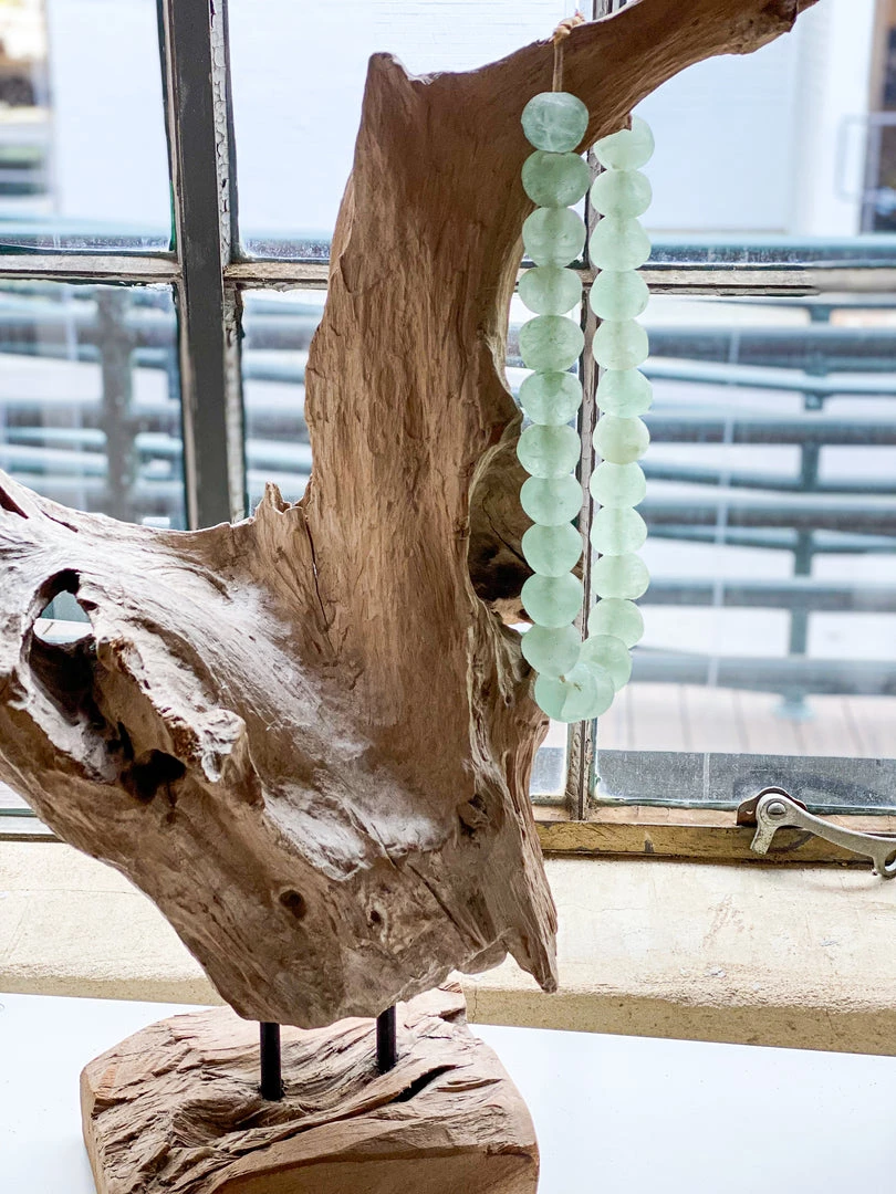 These recycled glass strands are handmade by people of Ghana- hand picked by Twine & Twig. The beads are made from scrap and unusable glass products that are ground to a fine powder before being poured into clay molds and baked turning them into these stunning glass beads.