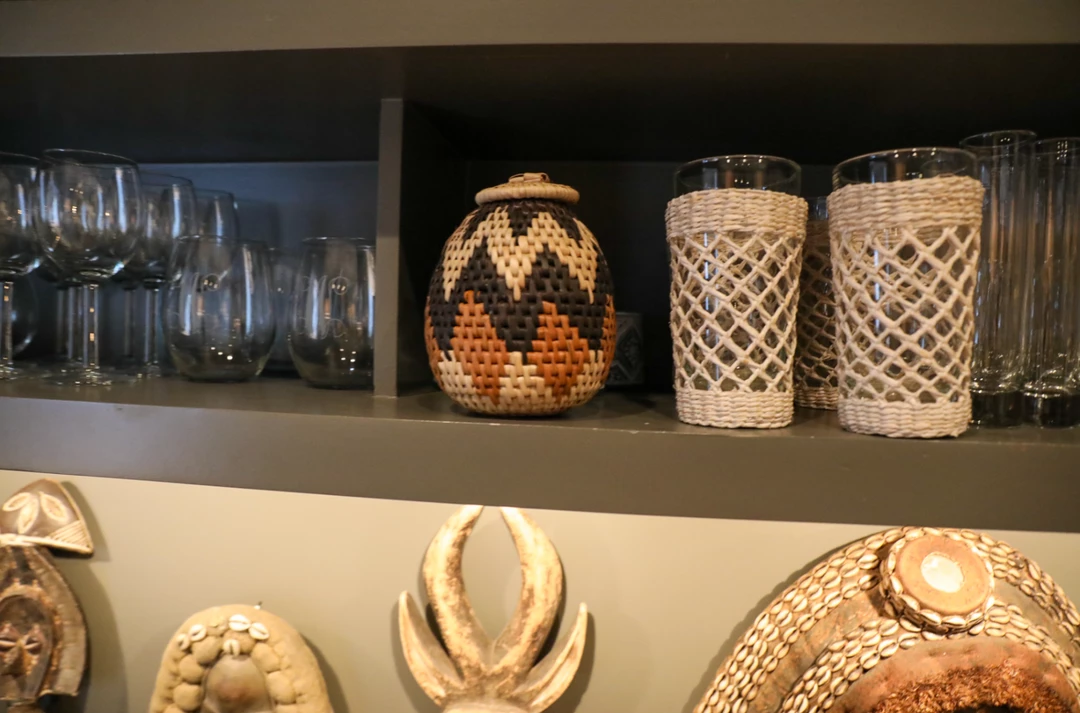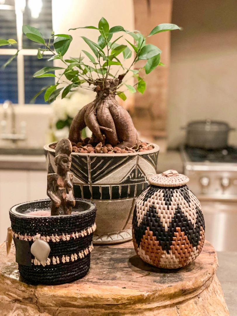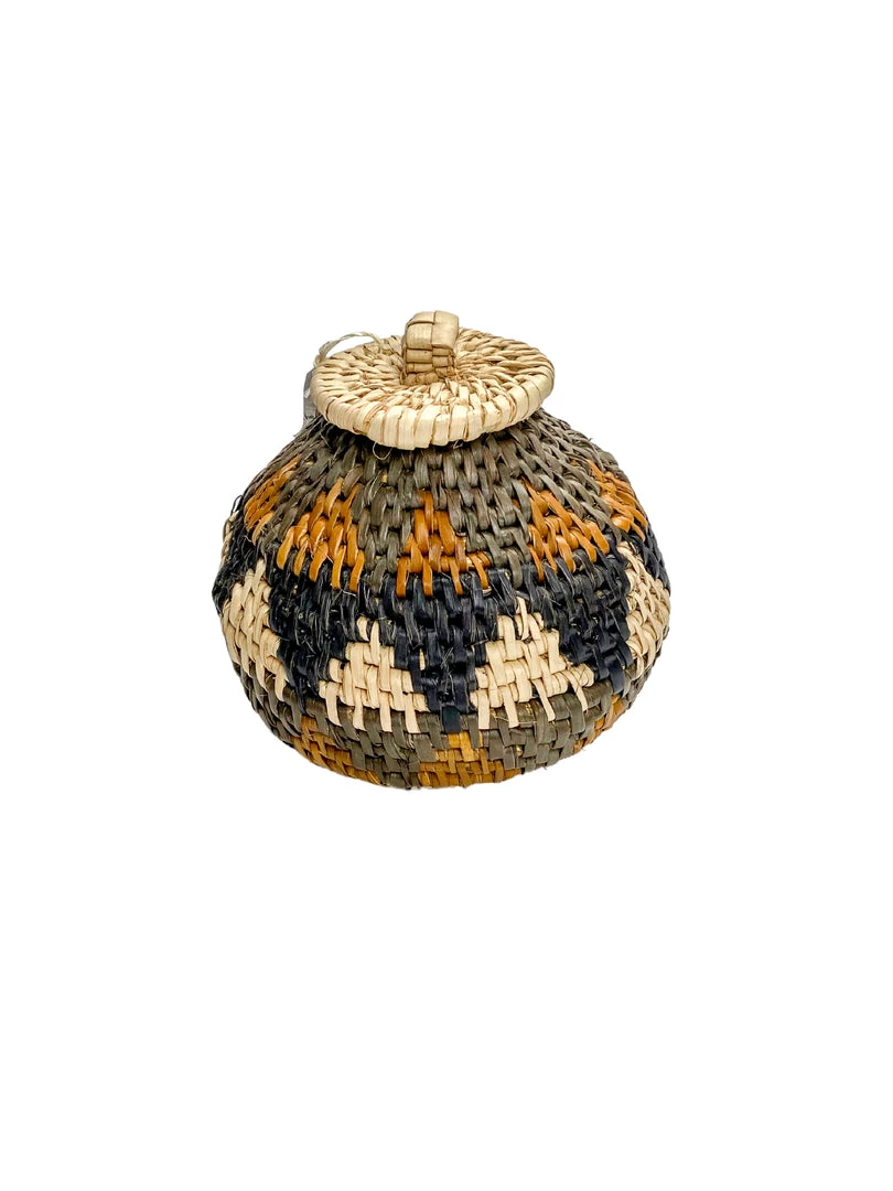 These traditional, lidded baskets are woven in South Africa out of ilala palm and wild grasses. They are traditionally used to store herbs and are naturally dyed using mud, leaves, ash, and plants.